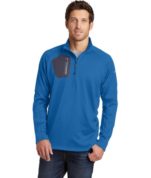 Smooth-faced fleece with a subtle grey print gives this 1/2-zip a sleek performance look. Reverse coil zipper, open cuffs and an open hem. Welded zippered chest pocket, contrast Eddie Bauer heat transfer logo on left sleeve. Made of 12.8-ounce, 95/5 poly/spandex.